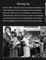 Moving Day April 8, 1964: Everyone was encouraged to volunteer to move the books across the plaza from the old Alumni Memorial Library to the new building. Students had a “Book Holiday” of from classes to assist in creatng the human book chain that carried materials up the steps. Even the Albright Lion took tme to move some books.