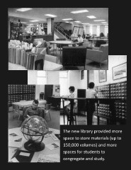 Add informaton and pic- tures from students us- ing the early library The new library provided more space to store materials (up to 150,000 volumes) and more spaces for students to congregate and study.