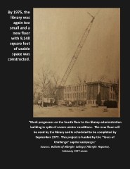 By 1975, the library was again too small and a new foor with 9,148 square feet of usable space was constructed. “Work progresses on the fourth foor to the library-administraton building in spite of severe winter conditons. The new foor will be used by the library and is scheduled to be completed by September 1977. This project is funded by the “Years of Challenge” capital campaign.” Source: Bulletn of Albright College/ Albright Reporter, February 1977 cover.