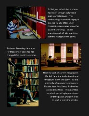 To fnd journal artcles, students had to sif through volumes of print journal indexes . This methodology started changing in the mid-to-late 1980s when CD-ROM statons were added for student searching. Online searching and of-site searching came to Albright in the 1990s. Students browsing the stacks for that perfect book has not changed that much in decades. Note the rack of current newspapers (far lef ) and the student reading a newspaper in the late 1990s. At this point only a few major newspapers, like the New York Times, had online accessible artcles. These artcles required special login procedures and the papers charged a fee to read or print the artcles.
