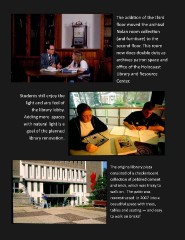 The additon of the third foor moved the archival Nolan room collecton (and furniture) to the second foor. This room now does double duty as archives patron space and ofce of the Holocaust Library and Resource Center. Students stll enjoy the light and airy feel of the library lobby. Adding more spaces with natural light is a goal of the planned library renovaton. The original library plaza consisted of a checkerboard collecton of pebbled cement and brick, which was tricky to walk on. The pato was reconstructed in 2007 into a beautful space with trees, tables and seatng — and easy to walk on bricks!