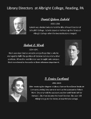 Library Directors at Albright College, Reading, PA Daniel Gideon Lubold 1926-1934 Lubold was elected twice to hold the ttle of head librarian of Schuylkill College. Lubold stayed on to head up the library at Albright College when the two insttutons merged. Robert L. Work 1934-1941 Work was described as versatle and perhaps that is why he managed to fulfll the positon of librarian but also many other positons. When the next librarian was brought onto campus, Work transferred to Harvard and their reference department. F. Louise Eastland 1941-1943 Afer receiving her degree in Library Science from Drexel Insttute (University today) she came to work as the assistant to Robert Work. She only held the assistant positon untl Work lef for Harvard . She then became the head librarian. She soon lef Albright to go to the library at Swarthmore College.