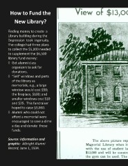 How to Fund the New Library? Finding money to create a Library building during the Depression took ingenuity. The college had three plans to collect the $5,000 needed to supplement the $6,500 library fund money: Get alumni class organizers to ask for donatons. “Sell” windows and parts of the library as memorials, e.g., a large window would cost $50; the freplace, $100; and smaller windows cost $10 and $25. This fundraiser hoped to raise $3,000. Alumni who could not aford a memorial were encouraged to save a dime a day and donate those funds. Source: informaton and graphic: Albright Alumni Record, June 1, 1934.